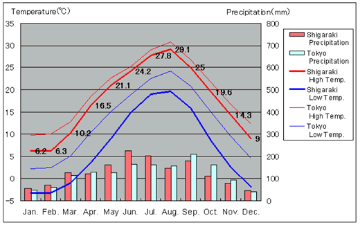 信楽の年間気温12.2度、年間最高気温17.4度、年間最低気温7度、年間降水量1513.4ミリメートル