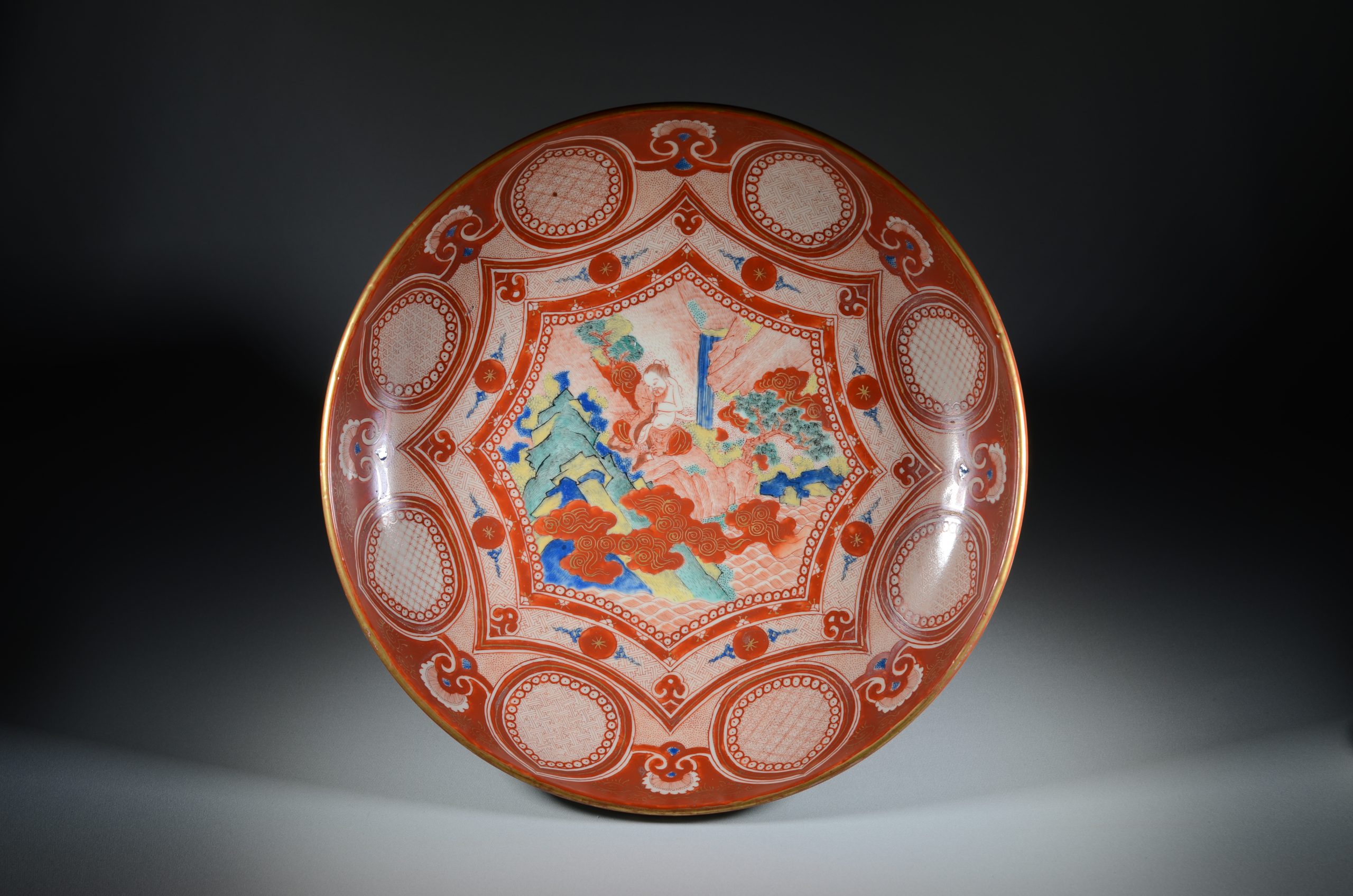 Gong-shaped serving dish(dorabachi) with Chinese scholar-hermit, Xuyou Miyamoto Kiln Japan, Edo Period,19th century(pre 1859) Kutaniyaki Art Museum collction