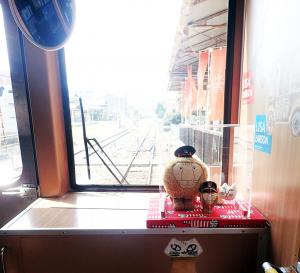 列車が信楽駅に到着!本展のメイン色である真っ赤な車両に巨大なリサのネコが迎えてくれます。