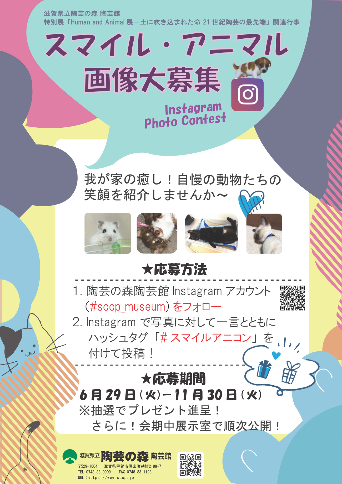 陶芸の森陶芸館公式インスタグラムアカウントをフォローして、ご自慢の動物たちの笑顔画像をお送りください。会期中、コメントとともに展覧会会場にて展示します。