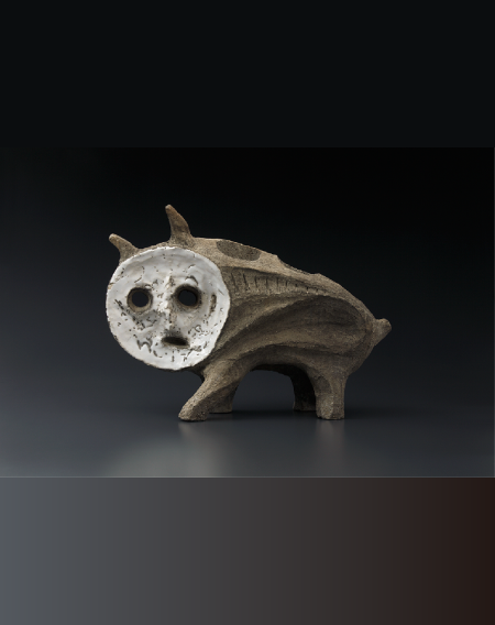 1954年に常滑で岡本太郎が制作した「犬の植木鉢」は、その後量産が試みられた。信楽で制作され、全国各地に送られた「坐ることを拒否する椅子」、その他「むすめ」や「歩み」など、陶芸を通して実現させた岡本太郎の量産への想いをたどります。