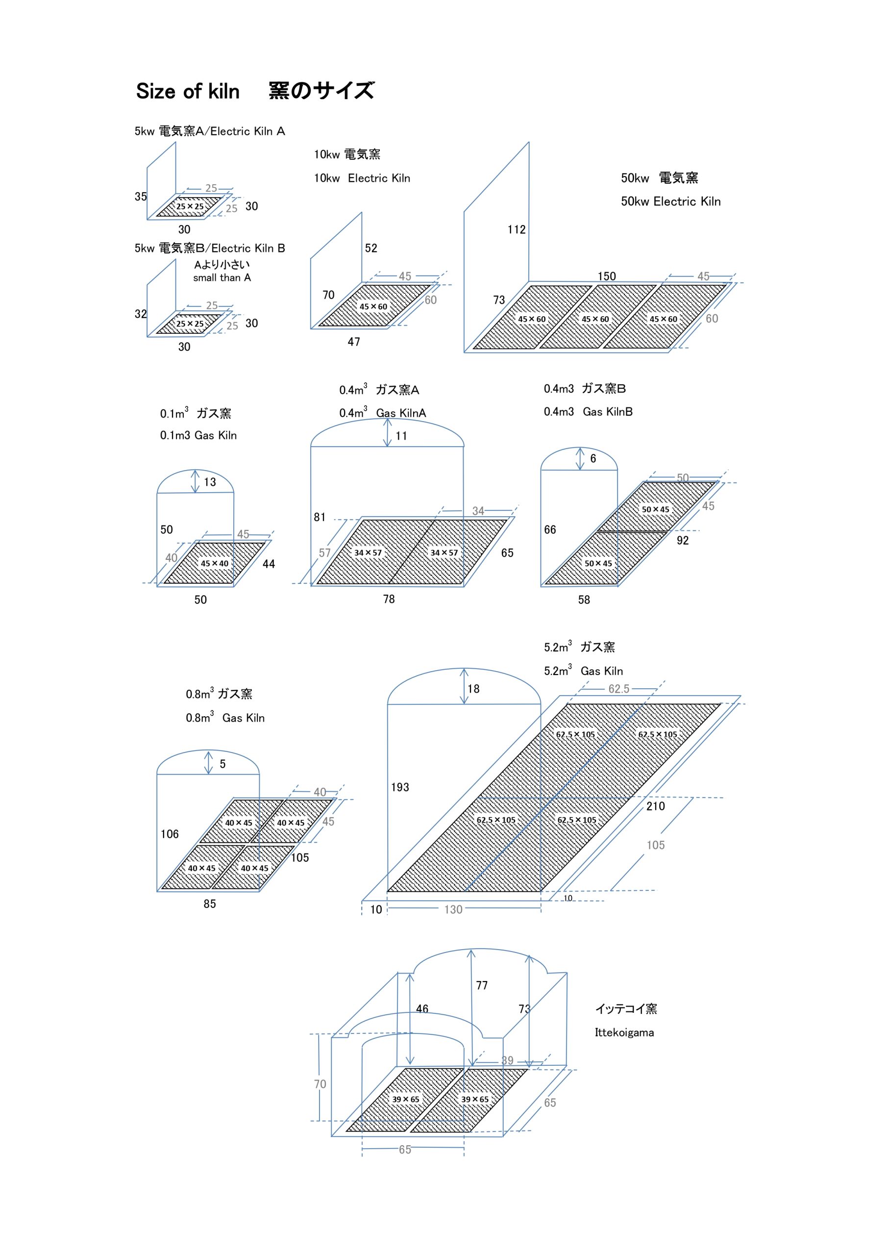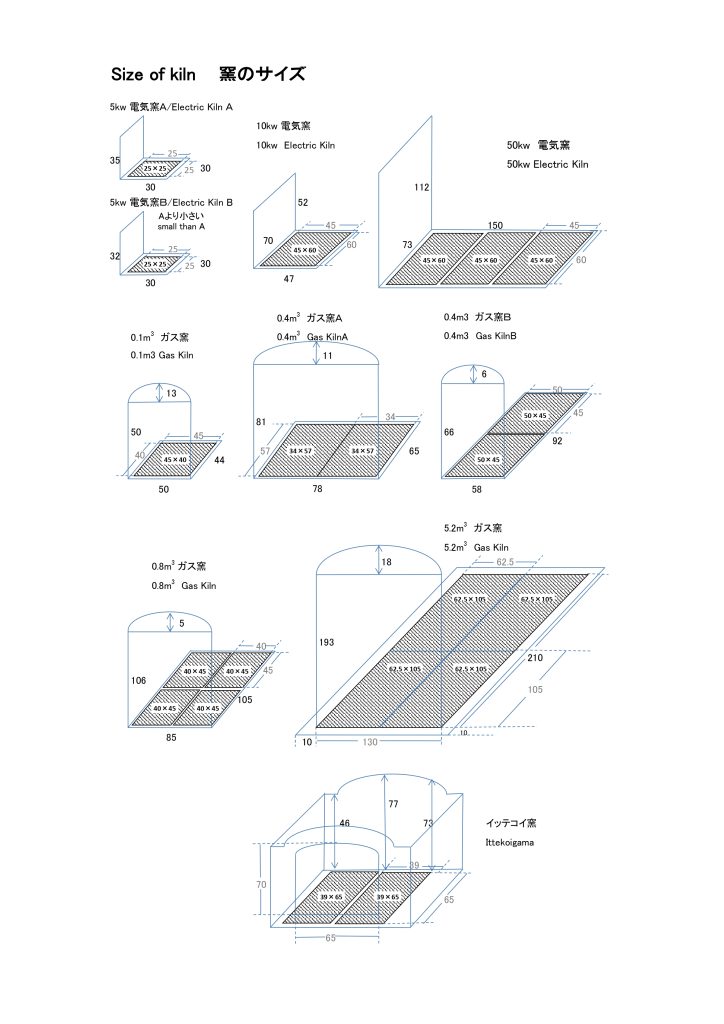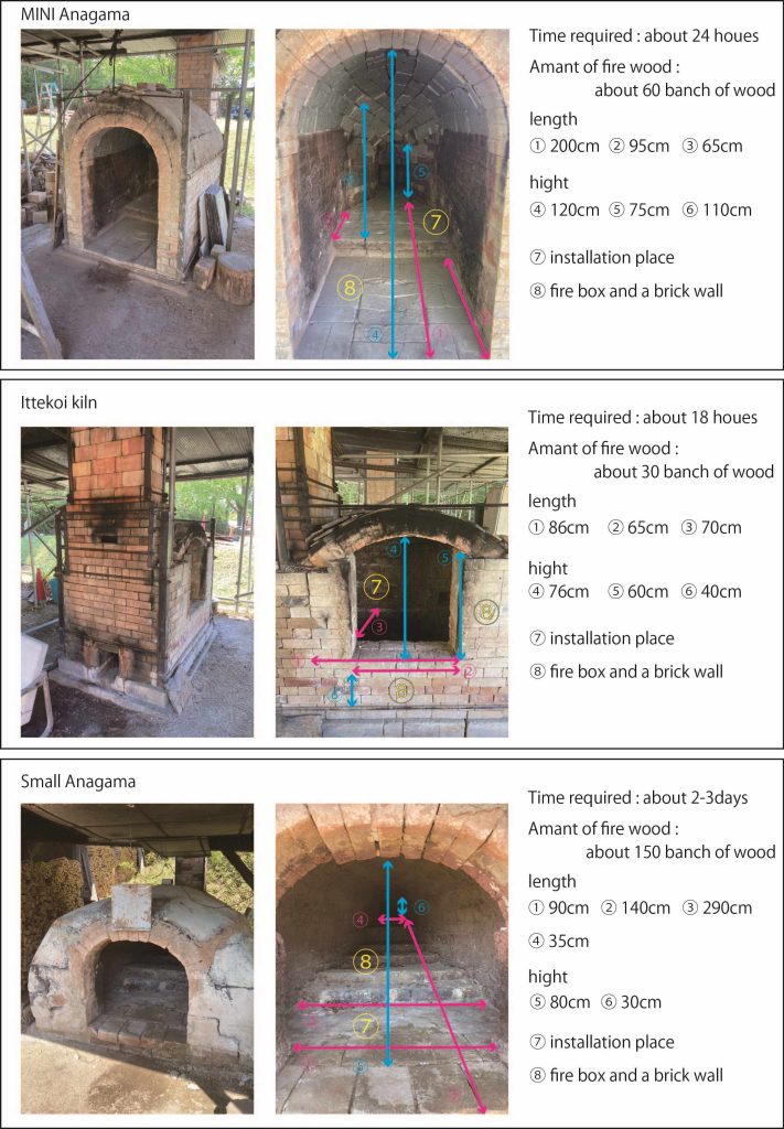 各焼成室の大きさ、焼成時間、薪の束数は概ね以下のとおりです。
