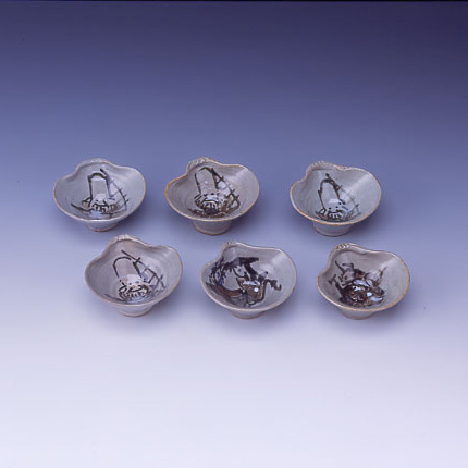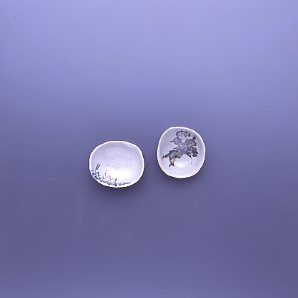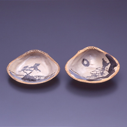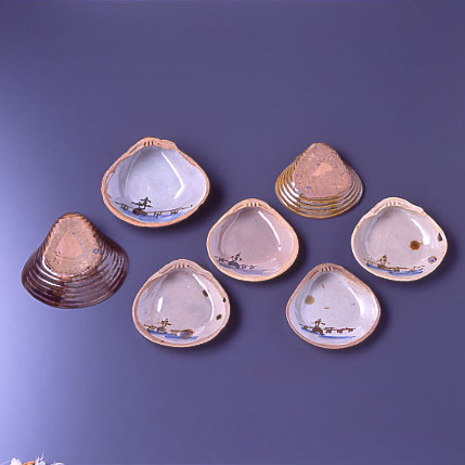 Corbicula Shaped Sake Cups with OTSU style Paintings Design, Overglaze Enamels