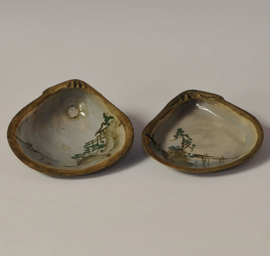 Corbicula Shaped Covered Box with OMI-HAKKEI(Celebrated Place in OMI) Design, Overglaze Enamels