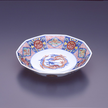 Ten-Cornered Bowl with Dragon Design, Overglaze Enamels